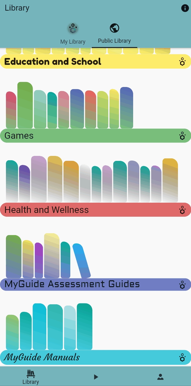Guides consist of an interactive series of pages that can prompt, inform, and exchange information with a MyGuide user. They can be used for task oriented lessons, self-expression questionnaires, checklists, and many more functions. They are entirely customizable to reflect the wants and needs of the user. Guides can be placed into Shelves. They can also be copied and shared, to and from other shelves and libraries.